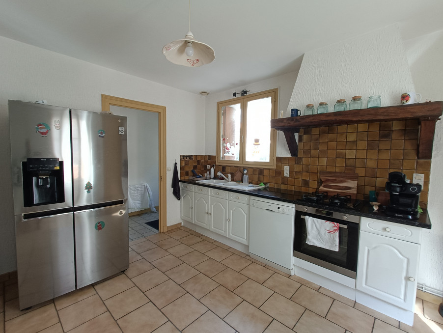 Cette partie est constituée d'une pièce avec évier (28 m²) carrelage carreau de ciment, potager, poutres... A l'étage : une pièce.