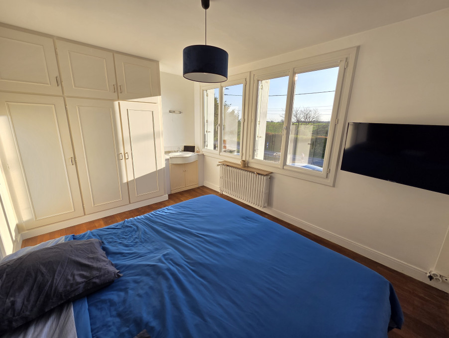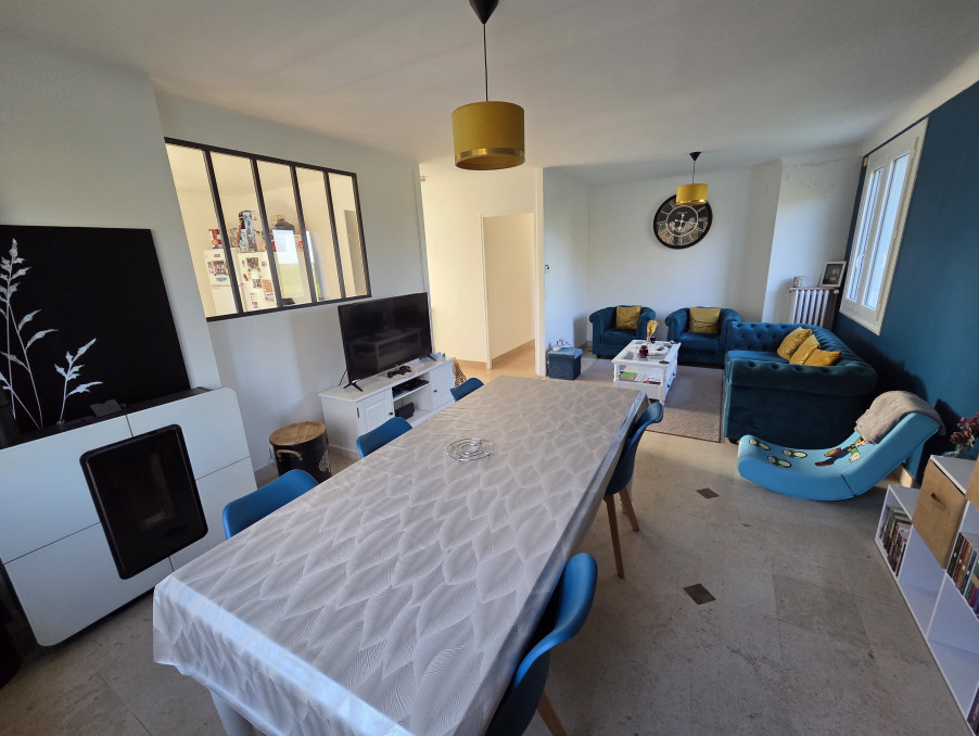 Il se compose d’une entrée (porte alu neuve) menant à une cuisine aménagée et équipée, ainsi qu'un séjour-salle à manger lumineux agrémenté d’un poêle à granulés. Un dégagement dessert trois belles chambres sur parquet dont deux avec placard, une salle de bains et un WC.
